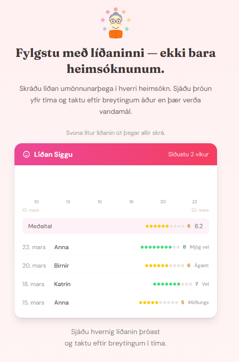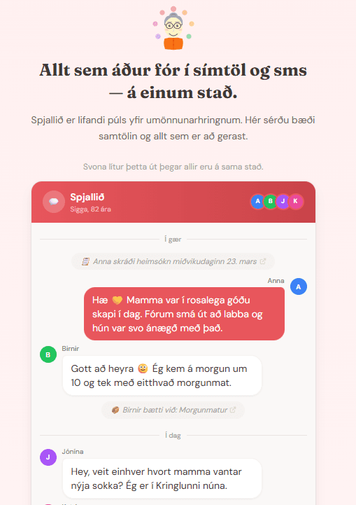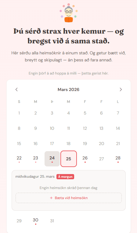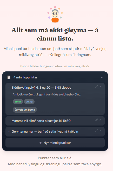 Tól fyrir umönnunarhringi, ættingja, vini og nágranna sem halda utan um umönnunina saman. Hannað fyrir þann raunverulega og oft flókna veruleika sem fylgir því þegar margir þurfa að láta hlutina ganga upp í sameiningu.